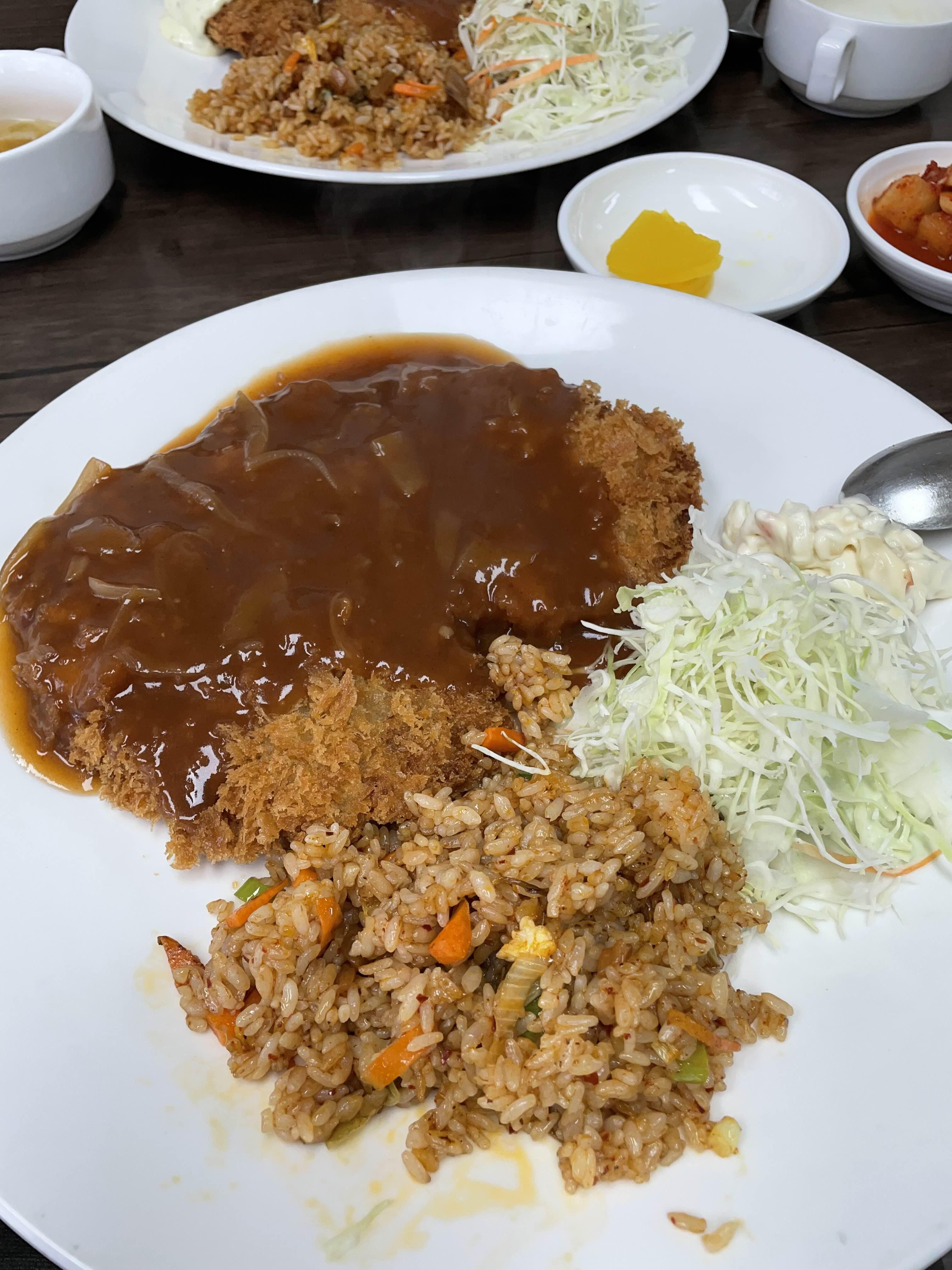 볶음밥으로 나왓지만 오무라이스를 시키면 오무라이스 소스와 계란이 덮여 돈까스 옆에 자리를 해서 나온다.